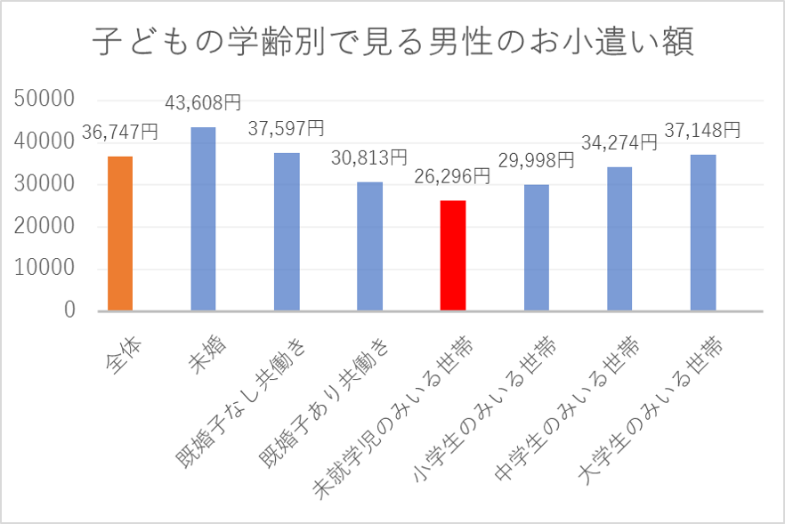 さらに詳しく見てみると、未就学児がいる世帯の男性のお小遣いは26,296円と平均よりも1万円ほど少なくなっています。