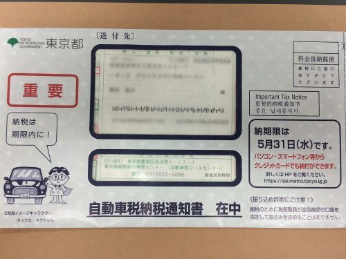 ゴールデンウィーク明けに自宅のポストを見たら、このような郵便物が届いていました。自動車を持っている人は必ずかかる固定費のひとつ、自動車税の納付通知書です。