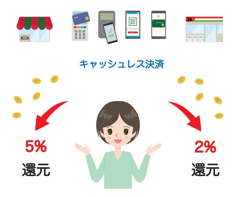 つまり、対象店舗等で買い物をする際に、クレジットカードや電子マネー、スマホ決済などのキャッシュレスで支払いをすると、買った額に応じて2~5%のポイントがもらえるので、実質ポイント分安く、もしくはお得になるということです。