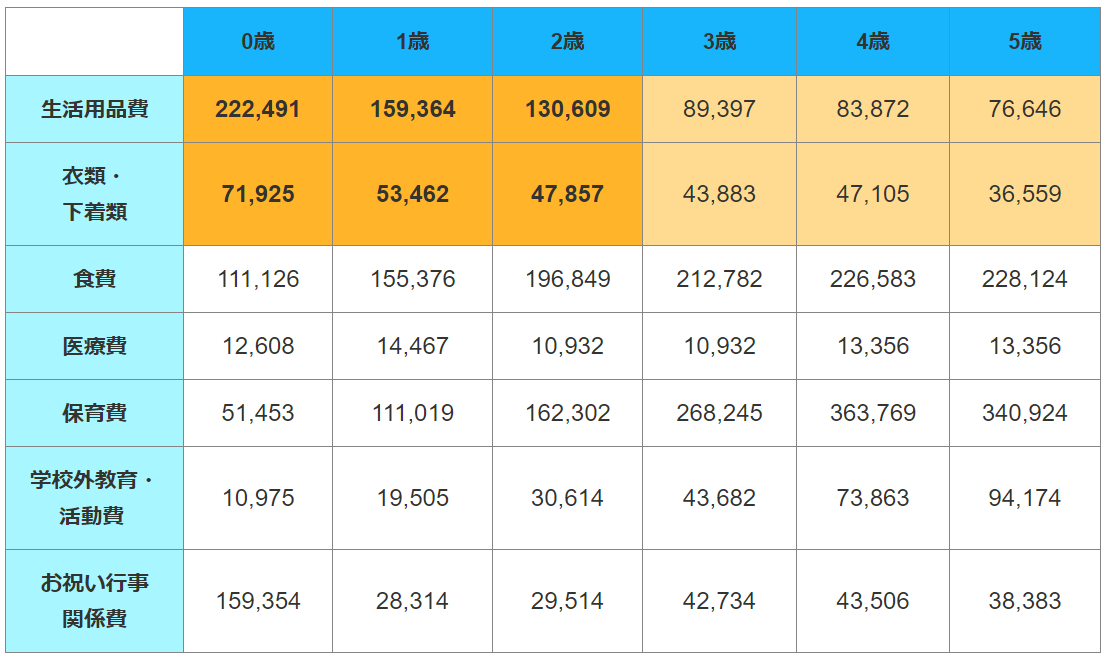 0歳~2歳の生活用品費が特に高くなっています。ここでの生活用品とは、消耗品やおもちゃ、絵本など。衣類・下着類も同様に、低い年齢で出費が多い傾向があります。