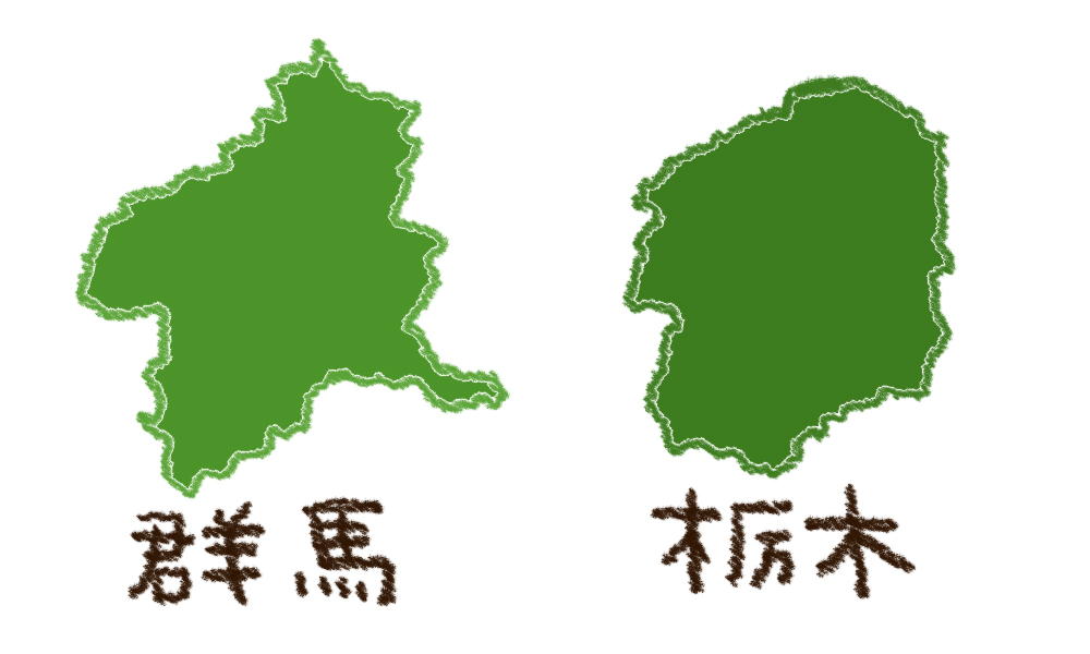 飛んでいる鶴の形が「群馬県」、ちょっとゴツゴツしてるいちごに見えるのが「栃木県」