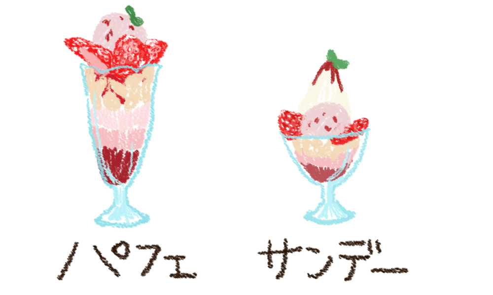 なんとなく縦長の容器に入っていて、コーンフレークとかアイスで層になっているのが「パフェ」、背の低い容器に入っていてアイスにいろいろトッピングされたのが「サンデー」?