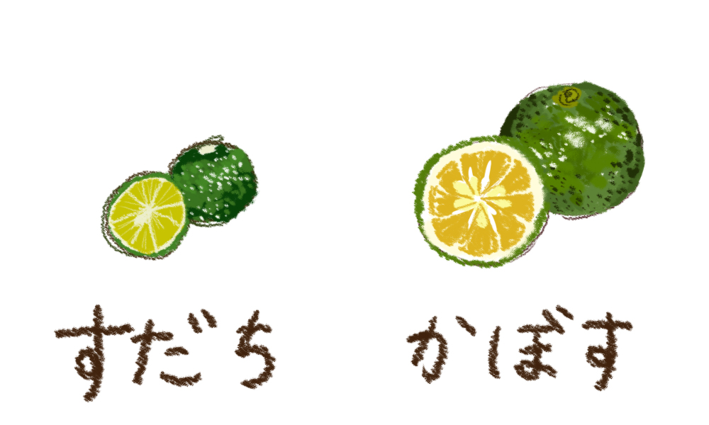 「すだち」は徳島県の名品、「かぼす」は大分県の名品だそう。大きさも色も違う~!