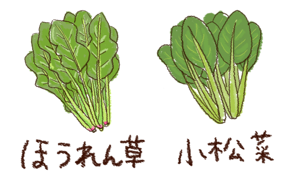 「ほうれん草」は「小松菜」と比べると葉っぱがギザギザしていて茎がピンクぽくなっている!茎を見れば一目瞭然だ。