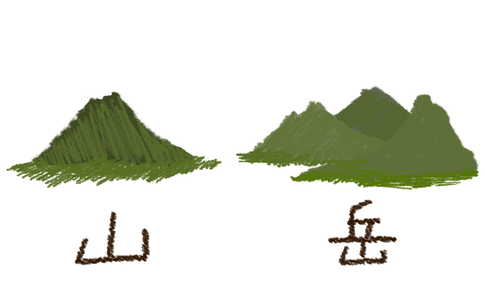 平地よりも盛り上がっているのが「山」、より険しく隆起しているのが「岳」