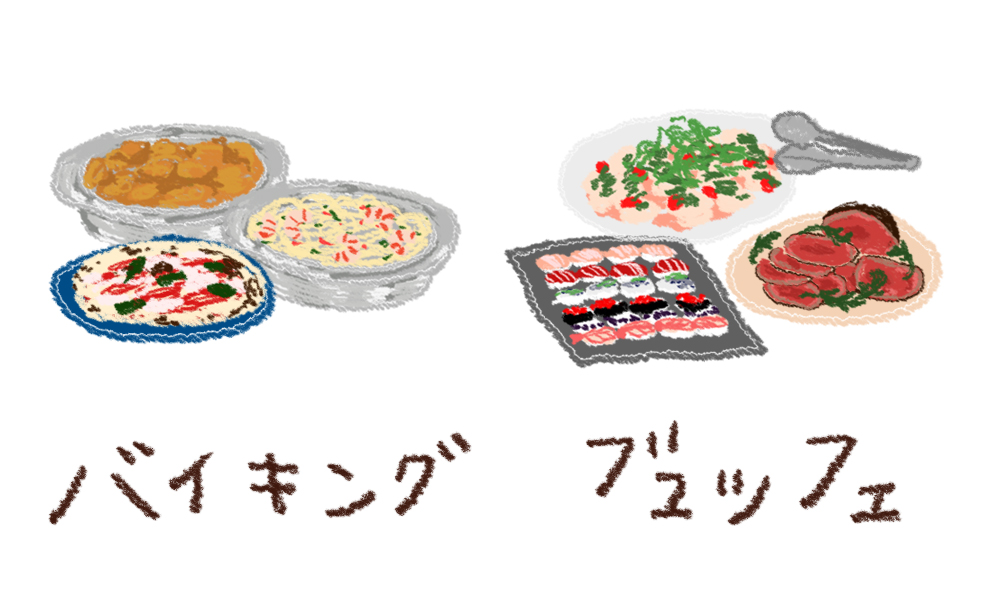 どちらもセルフ方式の食事だけど「バイキング」はたいてい食べ放題、「ビュッフェ」は食べ放題とは限らないそう。