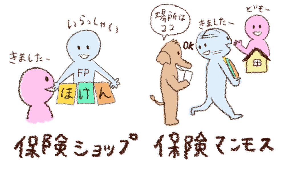 お客様が自分で足を運んでFPに会うのが「保険ショップ」、好きな時間や場所にFPが直接来てくれるのが「保険マンモス」。はい、ここも出ますよ~