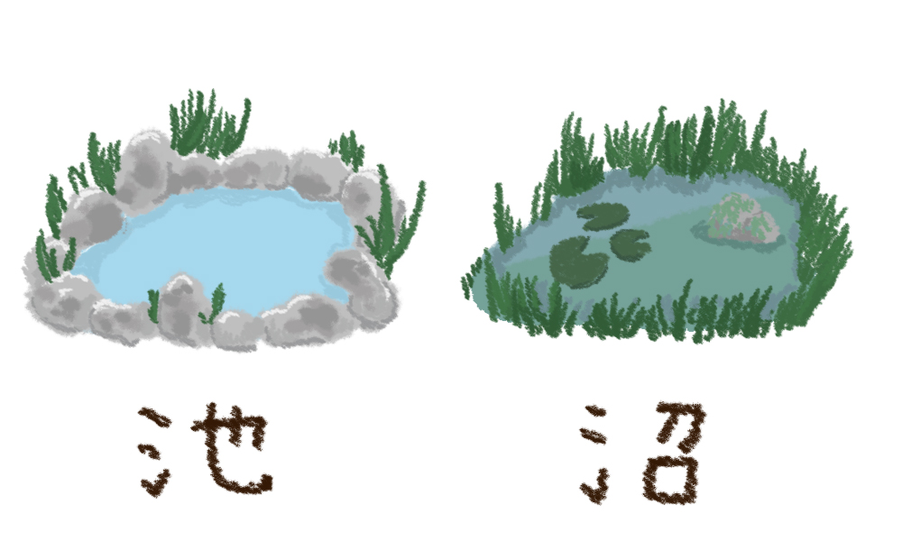 人工的につくられたぽいのが「池」、苔とか草とか生えてて濁ってるのは「沼」