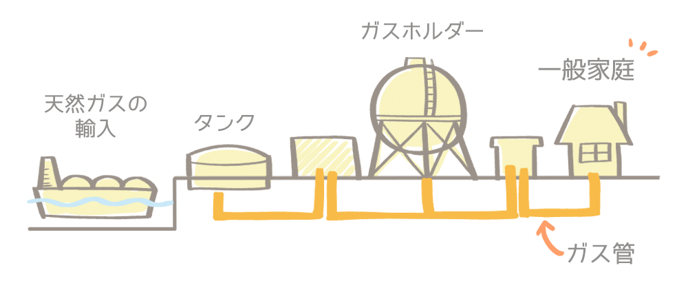 なるほど、輸入してきた天然ガスを家庭で使えるように調整して、それをガス管を通して供給していたんだね!都市ガスを使っている家にはこのガス管が通っているってことか。