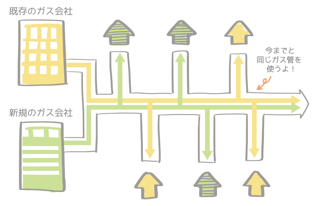 いままでガス管は決まった会社(東京ガスとか大阪ガス)が独占して使ってきたんだけど、自由化されるとガス管をいろいろな会社で共有できるようになるらしい。