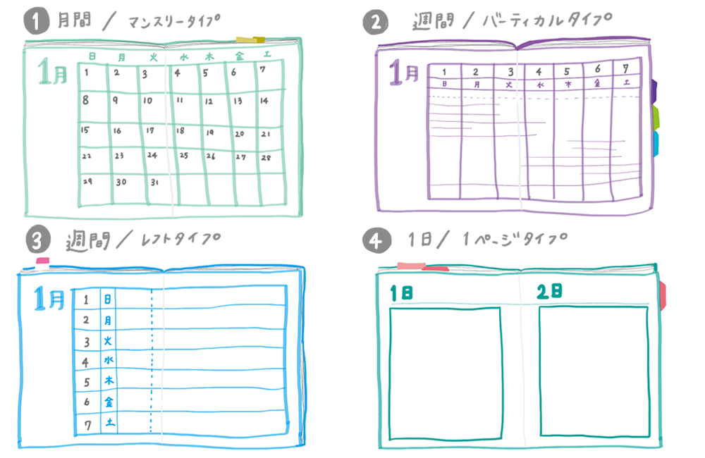 手帳選びで一番迷うのがスケジュールの形式です。仕事に向いているもの、プライベートに向いているもの、両方のいいとこどりをしたものがあります。それぞれの特徴をまとめました。まずは目的に合ったスケジュールの形式を選びましょう。