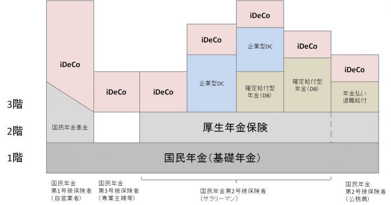 日本の年金制度は3階建ての構造となっています。1・2階部分は国が管理・運営する「公的年金」、3階部分は企業や個人が加入する「私的年金」です。