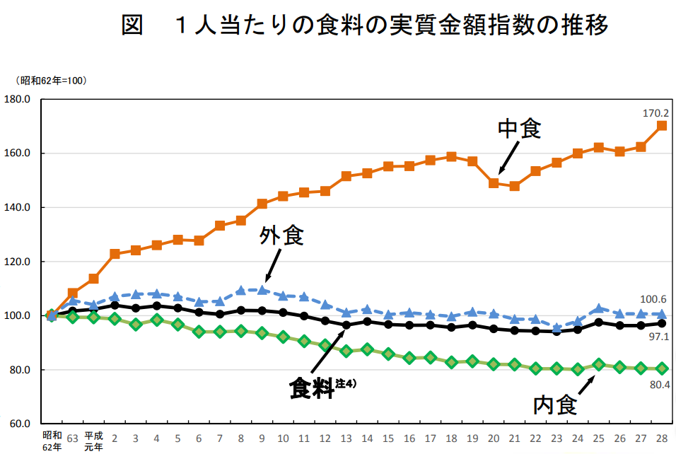 中食にかける一人当たりの金額は右肩上がりで(下図)、1987(昭和62)年を1とした場合、2018(平成28)年時点で約1.7にまで増えています。一方で外食はほぼ横ばい、内食(食材を買って調理をする食事)は約0.8となっており、料理をする回数を減らして調理済みの食べ物を購入する人が増えていると言えそうです。