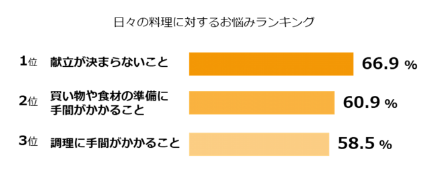 下図は、20~49歳の有職主婦に日々の料理へのお悩みを聞いたもの。この結果、私の料理嫌いの理由トップ3と見事に一致しています!